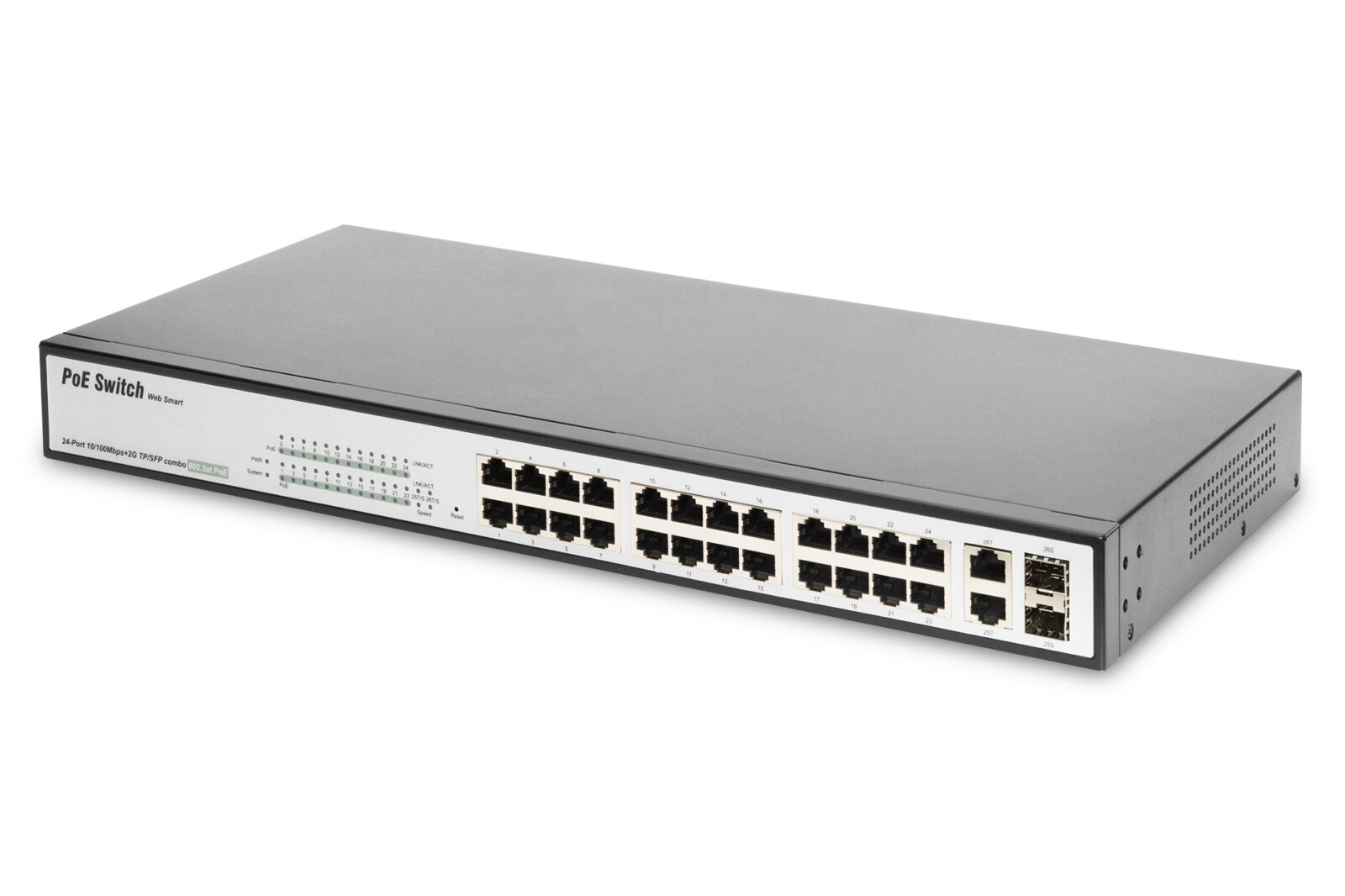 24-port RJ45, 2-port Combo TP/SFP, 370W PoE budget